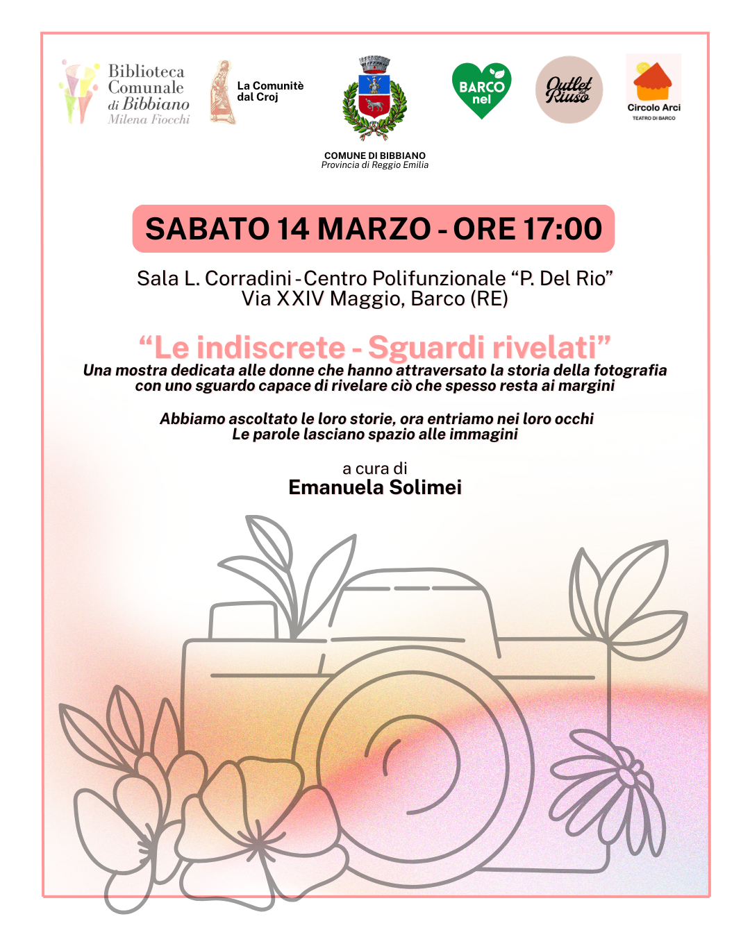 Sabato 14 marzo 2026 alle ore 17:00 vi aspettiamo a Barco, presso la Sala "L. Corradini" – Centro Polifunzionale “P. Del Rio” (Via XXIV Maggio), per l’inaugurazione della mostra “Le indiscrete – Sguardi rivelati”.